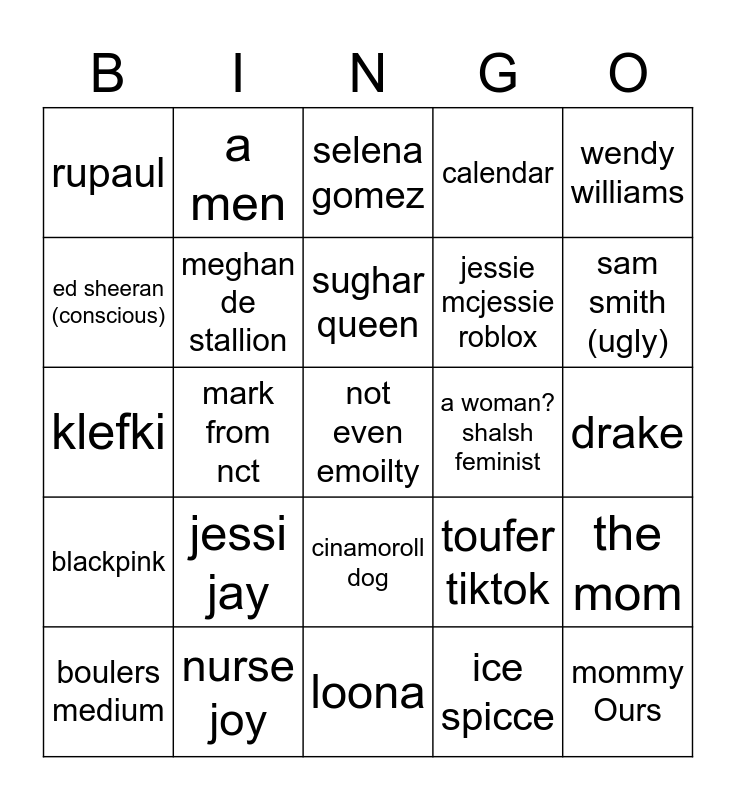 This bingo card has a free space and 24 words: jessi jay, nurse joy, sughar queen, boulers medium, wendy williams, rupaul, ed sheeran (conscious), a men, a woman? shalsh feminist, cinamoroll dog, jessie mcjessie roblox, klefki, toufer tiktok, the mom, meghan de stallion, ice spicce, drake, selena gomez, sam smith (ugly), mark from nct, mommy Ours, blackpink, calendar and loona.
