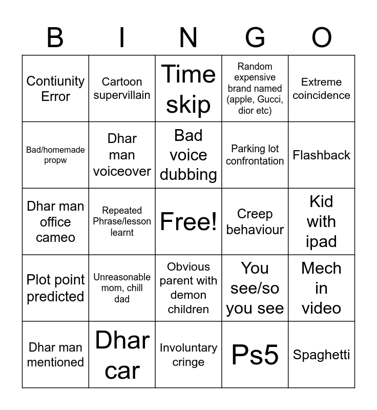 This bingo card has a free space and 24 words: Unreasonable mom, chill dad, Dhar car, Bad voice dubbing, Dhar man mentioned, Extreme coincidence, Contiunity Error, Bad/homemade propw, Cartoon supervillain, Creep behaviour, Obvious parent with demon children, Parking lot confrontation, Dhar man office cameo, You see/so you see, Mech in video, Dhar man voiceover, Ps5, Kid with ipad, Time skip, Flashback, Repeated Phrase/lesson learnt, Spaghetti, Plot point predicted, Random expensive brand named (apple, Gucci, dior etc) and Involuntary cringe.