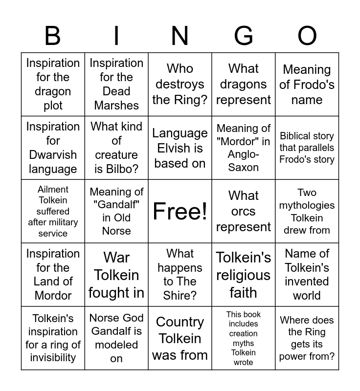 This bingo card has a free space and 24 words: War Tolkein fought in, Norse God Gandalf is modeled on, Language Elvish is based on, Tolkein's inspiration for a ring of invisibility, Meaning of Frodo's name, Inspiration for the dragon plot, Inspiration for Dwarvish language, Inspiration for the Dead Marshes, What orcs represent, What happens to The Shire?, Meaning of "Mordor" in Anglo-Saxon, Ailment Tolkein suffered after military service, Tolkein's religious faith, Name of Tolkein's invented world, What kind of creature is Bilbo?, This book includes creation myths Tolkein wrote, Two mythologies Tolkein drew from, Who destroys the Ring?, Biblical story that parallels Frodo's story, Meaning of "Gandalf" in Old Norse, Where does the Ring gets its power from?, Inspiration for the Land of Mordor, What dragons represent and Country Tolkein was from.