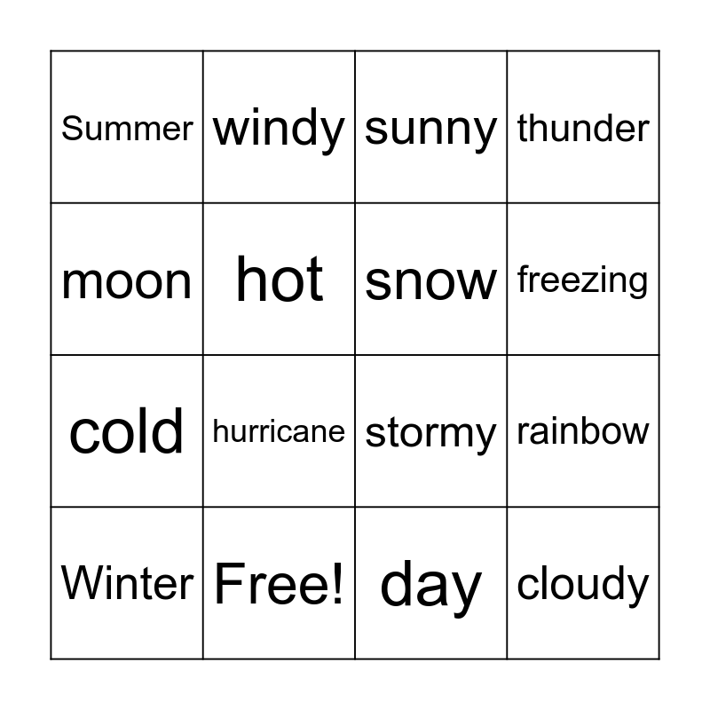 This bingo card has 28 words: beautiful, bad, cold, chilly, hot, sunny, windy, cloudy, Free!, humid, stormy, thunder, lightning, tornado, hurricane, hail, rain, snow, freezing, Spring, Summer, Fall, Winter, rainbow, day, night, moon and stars.