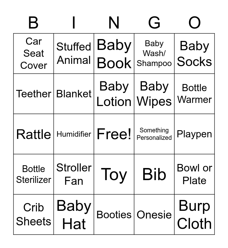 This bingo card has a free space and 36 words: Breastfeeding Cover, Bath Toys, Wash Cloths, Blanket, Bib, Bottle Sterilizer, Baby Lotion, Bottle, Baby Socks, Drying Rack, Humidifier, Baby Wash/ Shampoo, Pacifier, Something Personalized, Bottle Warmer, Car Seat Cover, Baby Gate, Stroller Fan, Burp Cloth, Baby Book, Playpen, Bowl or Plate, Baby Hat, Crib Sheets, Booties, Stuffed Animal, Rattle, Sound Machine, Baby Wipes, Teether, Car Seat Base, Hooded Towel, Onesie, Toy, Car Seat and Cup.