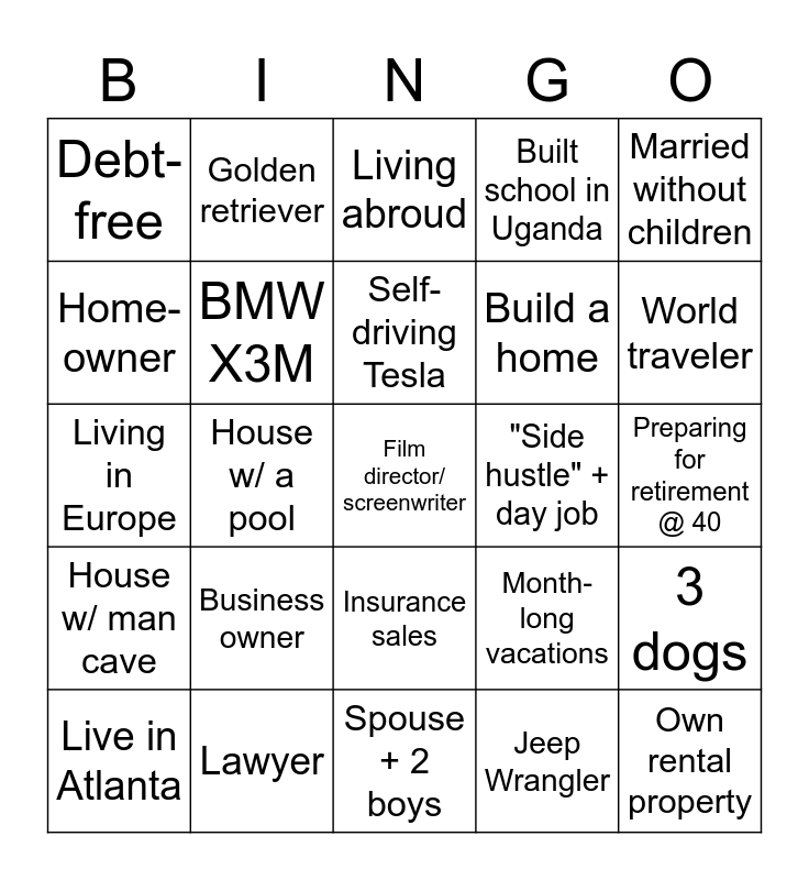 This bingo card has 25 words: Business owner, Spouse + 2 boys, Self-driving Tesla, Live in Atlanta, Married without children, Debt-free, Home-owner, Golden retriever, "Side hustle" + day job, Insurance sales, Build a home, Living in Europe, Month-long vacations, 3 dogs, BMW X3M, Own rental property, Preparing for retirement @ 40, Living abroud, World traveler, House w/ a pool, Film director/ screenwriter, Lawyer, House w/ man cave, Built school in Uganda and Jeep Wrangler.