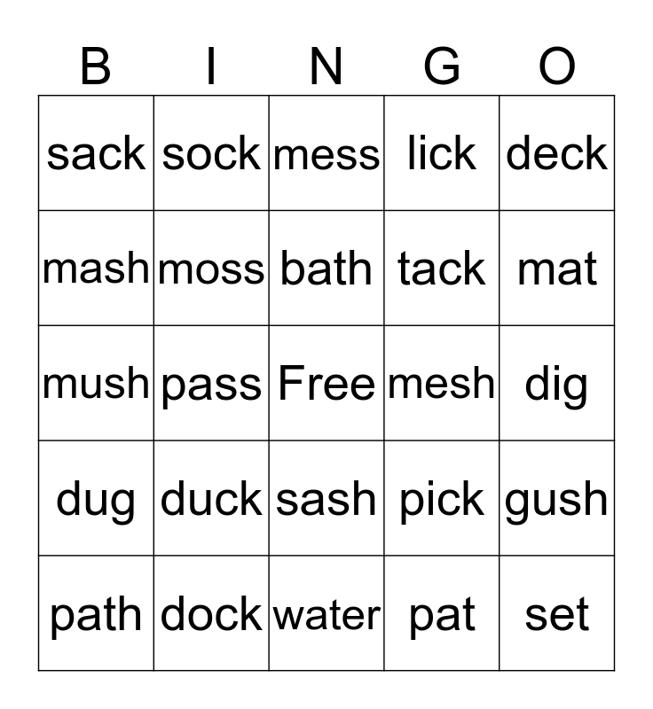 This bingo card has a free space and 24 words: duck, dock, bath, path, deck, sack, mash, sock, mesh, sash, tack, mush, pick, gush, moss, pat, dig, mess, mat, pass, set, dug, lick and water.