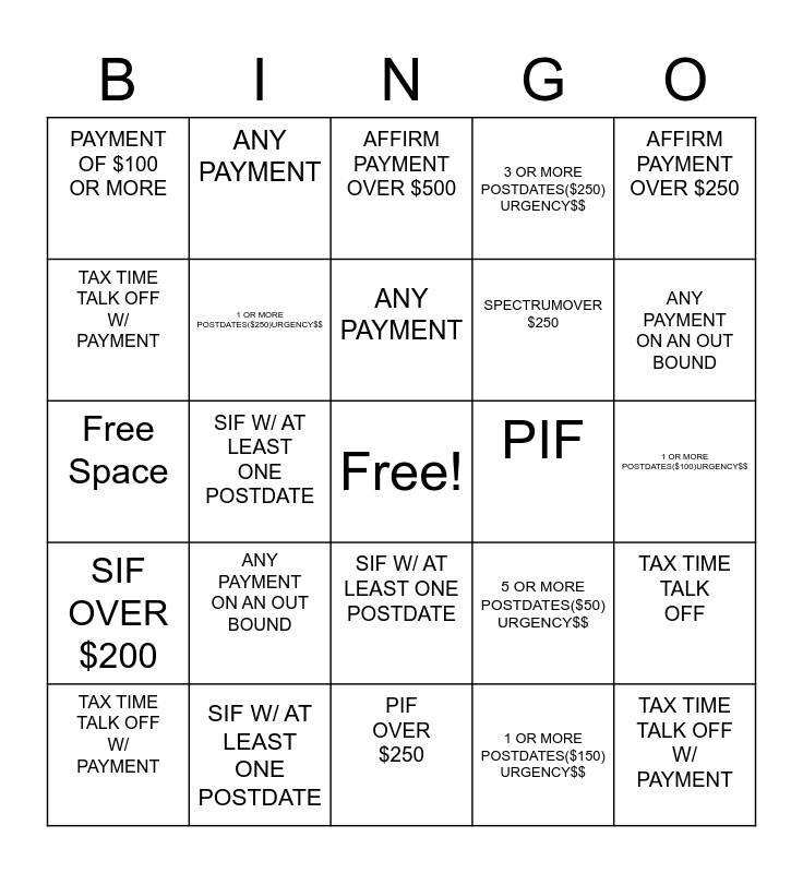 This bingo card has a free space and 25 words: ANY PAYMENT ON AN OUT BOUND, PIF OVER $250, ANY PAYMENT, TAX TIME TALK OFF W/ PAYMENT, AFFIRM PAYMENT OVER $250, PAYMENT OF $100 OR MORE, TAX TIME TALK OFF W/ PAYMENT, ANY PAYMENT, PIF, SIF W/ AT LEAST ONE POSTDATE, SPECTRUMOVER $250, Free Space, 5 OR MORE POSTDATES($50) URGENCY$$, TAX TIME TALK OFF, 1 OR MORE POSTDATES($250)URGENCY$$, PAYMENT OVER $250, 1 OR MORE POSTDATES($100)URGENCY$$, AFFIRM PAYMENT OVER $500, ANY PAYMENT ON AN OUT BOUND, SIF W/ AT LEAST ONE POSTDATE, TAX TIME TALK OFF W/ PAYMENT, SIF W/ AT LEAST ONE POSTDATE, SIF OVER $200, 3 OR MORE POSTDATES($250) URGENCY$$ and 1 OR MORE POSTDATES($150) URGENCY$$.