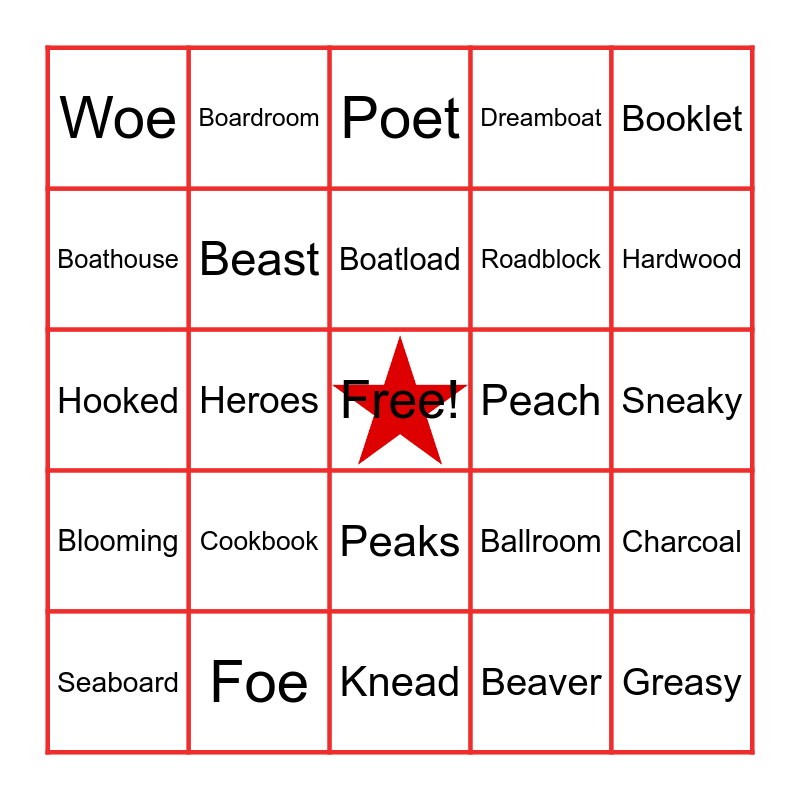 This bingo card has a free space and 30 words: Foe, Poem, Heroes, Echoes, Woe, Poet, Beast, Peaks, Peach, Knead, Sneaky, Greasy, Beaver, Ordeal, Hardwood, Football, Ballroom, Blooming, Cookbook, Booklet, Hooked, Cookie, Boardroom, Roadblock, Boathouse, Dreamboat, Charcoal, Seaboard, Boatload and Coaster.