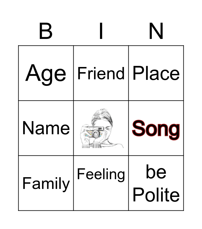 This bingo card has a free space and 11 words: A Pet, Feeling, be Polite, Family, Friend, Place, Song, (free), Name, Age and City.