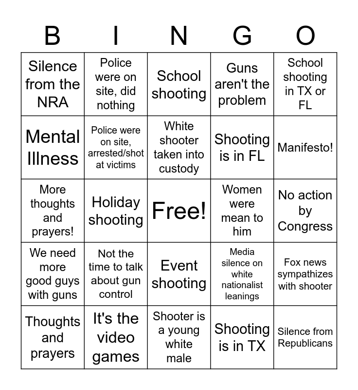 This bingo card has a free space and 24 words: Not the time to talk about gun control, It's the video games, White shooter taken into custody, Thoughts and prayers, School shooting in TX or FL, Silence from the NRA, Mental Illness, Police were on site, did nothing, Women were mean to him, Event shooting, Shooting is in FL, More thoughts and prayers!, Media silence on white nationalist leanings, Fox news sympathizes with shooter, Police were on site, arrested/shot at victims, Shooting is in TX, No action by Congress, School shooting, Manifesto!, Holiday shooting, Silence from Republicans, We need more good guys with guns, Guns aren't the problem and Shooter is a young white male.