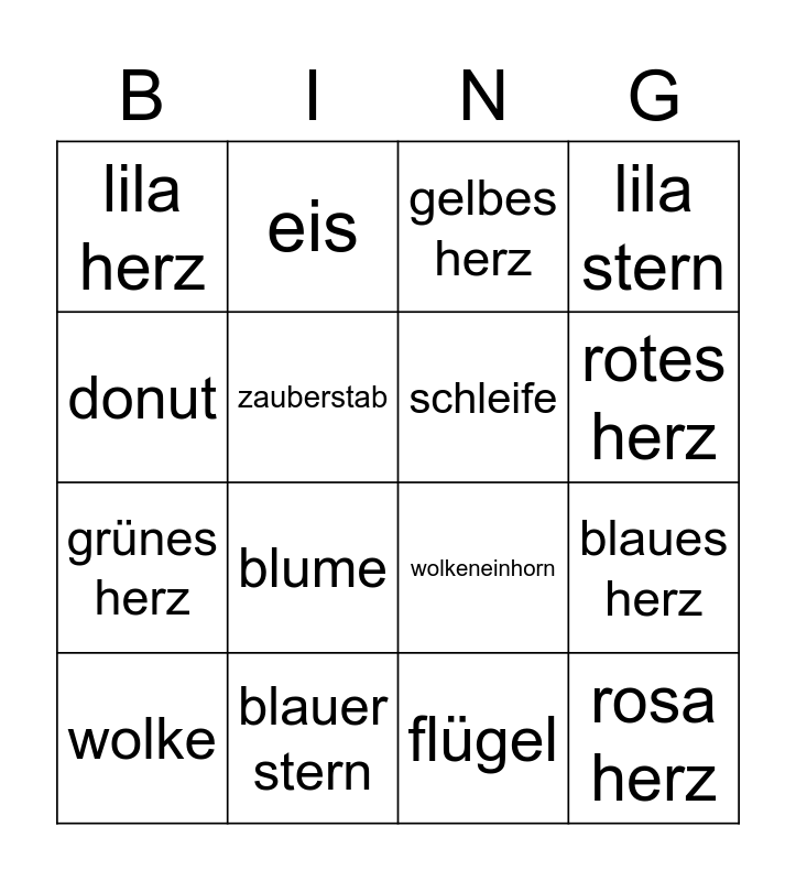 This bingo card has 24 words: regenbogen, pizza, rotes herz, bonbon, donut, lila herz, zauberstab, eis, blauer stern, sternschnuppr, grünes herz, wolkeneinhorn, einhorn stehen, grüner stern, schleife, diamant, flügel, gelbes herz, blume, blaues herz, wolke, rosa herz, lila stern and fliegendes einhorn.