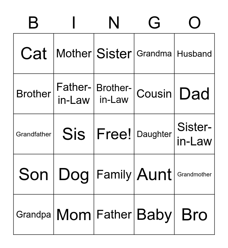 This bingo card has a free space and 27 words: Aunt, Uncle, Cousin, Father, Brother, Sister, Mother, Son, Daughter, Grandmother, Grandfather, Grandma, Grandpa, Mom, Dad, Mother-in-Law, Father-in-Law, Brother-in-Law, Dog, Cat, Sister-in-Law, Baby, Sis, Bro, Family, Husband and Wife.