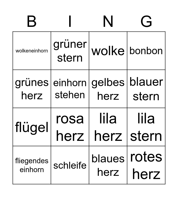 This bingo card has 24 words: regenbogen, pizza, blauer stern, sternschnuppr, grünes herz, wolkeneinhorn, einhorn stehen, grüner stern, schleife, diamant, flügel, lila herz, zauberstab, eis, gelbes herz, blume, blaues herz, wolke, rosa herz, lila stern, fliegendes einhorn, rotes herz, bonbon and donut.