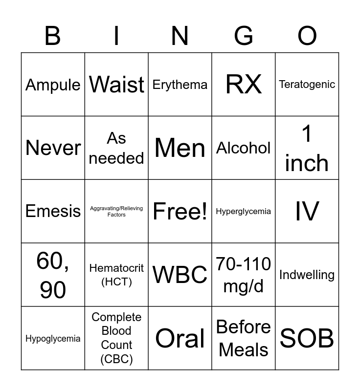 This bingo card has a free space and 30 words: Complete Blood Count (CBC), Incontinent, Aggravating/Relieving Factors, 5-7, Ampule, Erythema, As needed, WBC, Hyperglycemia, Oral, IV, SOB, Before Meals, Prostate, 1 inch, Quotation marks, 70-110 mg/d, 60, 90, Hematocrit (HCT), Teratogenic, Emesis, 1-2, Waist, Alcohol, Never, RX, Indwelling, Hypoglycemia, Men and Grapefruit Juice.