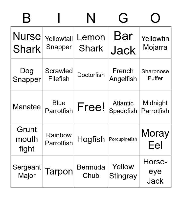 This bingo card has a free space and 29 words: Sergeant Major, Spotfin Butterflyfish, Blue Parrotfish, Porkfish, Nurse Shark, Lemon Shark, Scrawled Filefish, Rainbow Parrotfish, Atlantic Spadefish, Tarpon, Midnight Parrotfish, Horse-eye Jack, Bermuda Chub, Yellow Stingray, Sharpnose Puffer, Gray Angelfish, Hogfish, Grunt mouth fight, Yellowfin Mojarra, Manatee, Porcupinefish, Bermuda Chub, French Angelfish, Dog Snapper, Bar Jack, Yellowtail Snapper, Moray Eel, Doctorfish and Southern Stingray.
