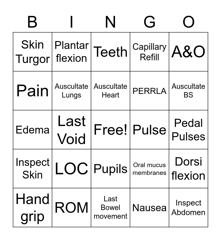 This bingo card has a free space and 24 words: LOC, ROM, Auscultate Heart, Hand grip, A&O, Skin Turgor, Pain, Plantar flexion, Pulse, Pupils, PERRLA, Edema, Oral mucus membranes, Dorsi flexion, Auscultate Lungs, Nausea, Pedal Pulses, Teeth, Auscultate BS, Last Void, Inspect Abdomen, Inspect Skin, Capillary Refill and Last Bowel movement.
