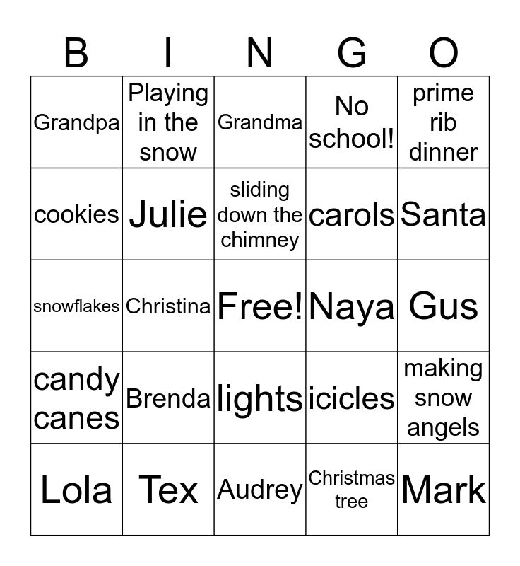 This bingo card has a free space and 29 words: Lola, Samuel, Christina, Todd, Grandpa, Grandma, Julie, Brenda, Naya, Tex, Gus, Mark, Audrey, Christmas tree, Santa, reindeer, lights, candy canes, prime rib dinner, snowflakes, icicles, presents, carols, cookies, No school!, Playing in the snow, making snow angels, sliding down the chimney and reading stories.