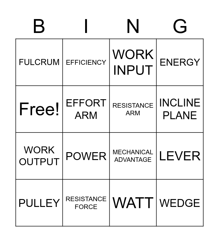 This bingo card has 16 words: RESISTANCE FORCE, LEVER, WORK INPUT, FULCRUM, WORK OUTPUT, EFFICIENCY, MECHANICAL ADVANTAGE, WATT, Free!, EFFORT ARM, PULLEY, ENERGY, POWER, INCLINE PLANE, RESISTANCE ARM and WEDGE.