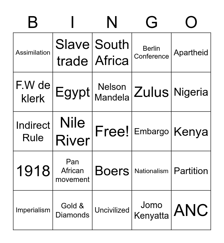This bingo card has a free space and 25 words: Pan African movement, Uncivilized, Nelson Mandela, Imperialism, Apartheid, Assimilation, F.W de klerk, Slave trade, Embargo, Boers, Zulus, Indirect Rule, Nationalism, Partition, Egypt, Sudan, Kenya, South Africa, Nigeria, Nile River, ANC, Gold & Diamonds, 1918, Berlin Conference and Jomo Kenyatta.
