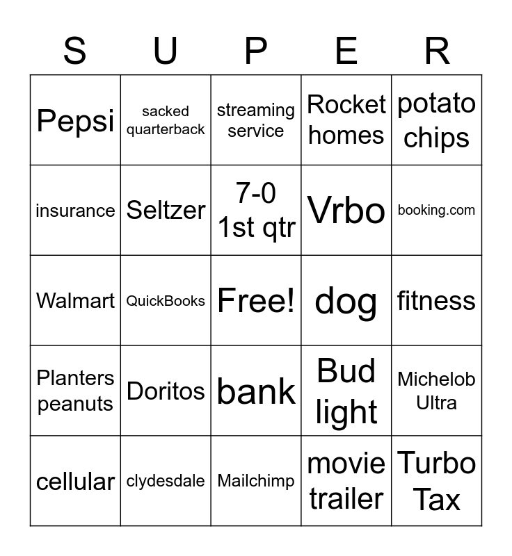 This bingo card has a free space and 24 words: Doritos, clydesdale, 7-0 1st qtr, cellular, potato chips, Pepsi, insurance, sacked quarterback, dog, bank, Vrbo, Walmart, Bud light, Michelob Ultra, Seltzer, movie trailer, fitness, streaming service, booking.com, QuickBooks, Turbo Tax, Planters peanuts, Rocket homes and Mailchimp.