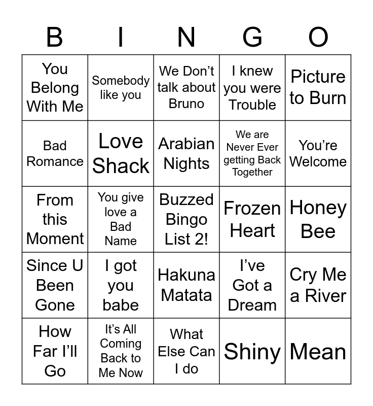 This bingo card has a free space and 62 words: What Makes you Beautiful, It’s All Coming Back to Me Now, Call Me Maybe, Since U Been Gone, Everytime We Touch, Achy Breaky Heart, Love Shack, Before He Cheats, We are Never Ever getting Back Together, I wanna Dance with Somebody, I knew you were Trouble, Single Ladies, Bad Romance, Wildest Dreams, Love Story, You Belong With Me, Mean, Picture to Burn, Teardrops, Arabian Nights, Frozen Heart, We Don’t talk about Bruno, How Far I’ll Go, Shiny, Grenade, Cant stop the Feeling, Marry You, Love Game, Cry Me a River, Mirrors, It Wasn’t ME, Angel, Suga Suga, Body Like a Back Road, Honey Bee, Somebody like you, Church Bells, Goodbye Earl, You give love a Bad Name, Flowers, From this Moment, A moment Like this, I got you babe, I hope You Dance, You’re Welcome, I’ve Got a Dream, One Jump Ahead, The Bare Necessities, True Colors, Into the Unknown, Hakuna Matata, What Else Can I do, A girl worth fighting for, Stand Out, Just around the river bend, When I am older, Un Poco Loco, He Mele No Lilo, I2I, Mother knows Best, Friends on the other Side and Fixer Upper.