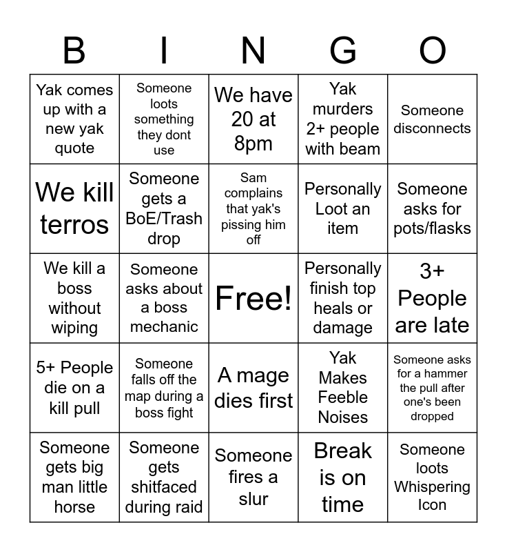 This bingo card has a free space and 24 words: Someone falls off the map during a boss fight, Someone gets shitfaced during raid, Sam complains that yak's pissing him off, Someone gets big man little horse, Someone disconnects, Yak comes up with a new yak quote, We kill terros, Someone loots something they dont use, Personally finish top heals or damage, A mage dies first, Personally Loot an item, We kill a boss without wiping, Yak Makes Feeble Noises, Someone asks for a hammer the pull after one's been dropped, Someone gets a BoE/Trash drop, Break is on time, 3+ People are late, We have 20 at 8pm, Someone asks for pots/flasks, Someone asks about a boss mechanic, Someone loots Whispering Icon, 5+ People die on a kill pull, Yak murders 2+ people with beam and Someone fires a slur.