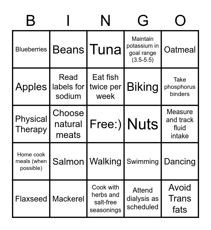 This bingo card has a free space and 24 words: Salmon, Mackerel, Eat fish twice per week, Flaxseed, Oatmeal, Blueberries, Apples, Beans, Nuts, Walking, Biking, Physical Therapy, Swimming, Dancing, Read labels for sodium, Attend dialysis as scheduled, Measure and track fluid intake, Tuna, Take phosphorus binders, Choose natural meats, Avoid Trans fats, Home cook meals (when possible), Maintain potassium in goal range (3.5-5.5) and Cook with herbs and salt-free seasonings.