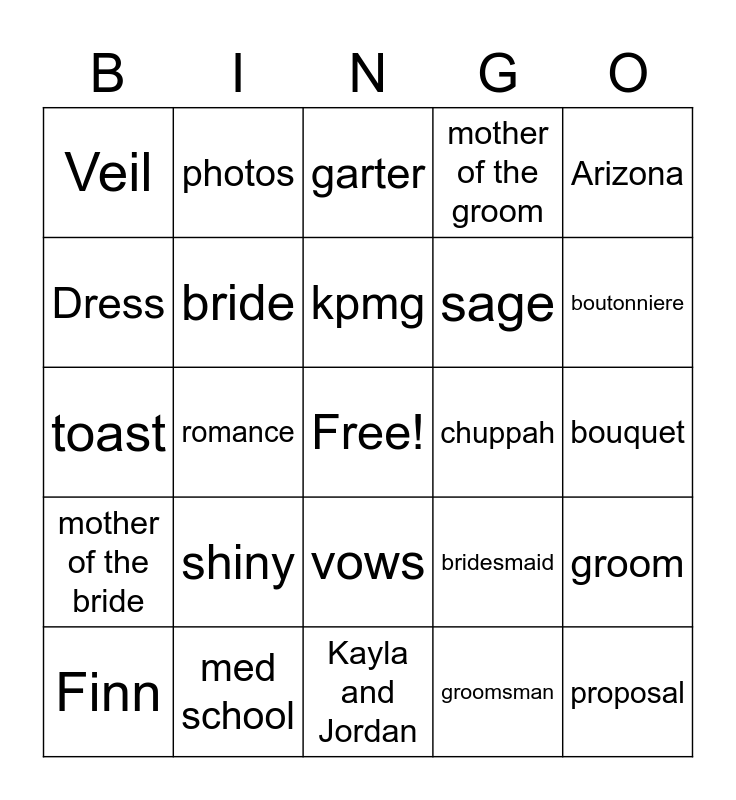 This bingo card has a free space and 24 words: shiny, med school, kpmg, Finn, Arizona, Veil, Dress, photos, chuppah, vows, sage, toast, bridesmaid, groom, bride, groomsman, bouquet, garter, boutonniere, romance, proposal, mother of the bride, mother of the groom and Kayla and Jordan.