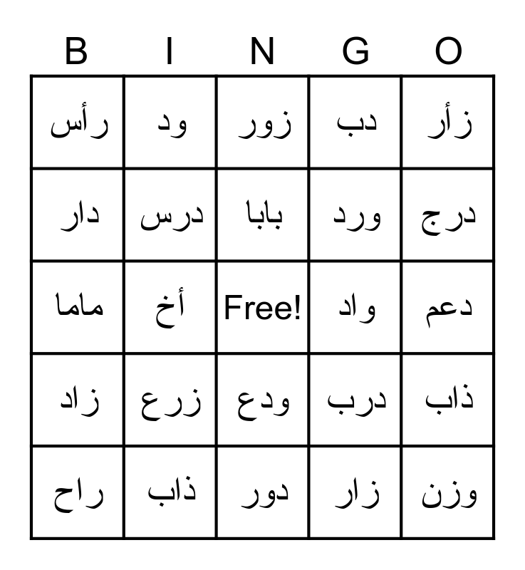This bingo card has a free space and 28 words: ذاب, درب, ورد, زار, دار, زور, ود, زاد, واد, راح, ماما, دب, ذاب, دور, درج, وز, زرع, درس, بابا, ودع, رأس, درج, وزن, أخ, دعم, درب, زأر and زر.