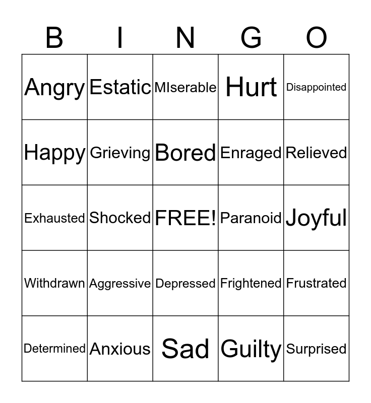 This bingo card has a free space and 24 words: Aggressive, Anxious, Bored, Determined, Disappointed, Angry, Happy, Estatic, Paranoid, Depressed, Enraged, Exhausted, Frightened, Frustrated, Grieving, Guilty, Joyful, MIserable, Relieved, Shocked, Surprised, Withdrawn, Hurt and Sad.