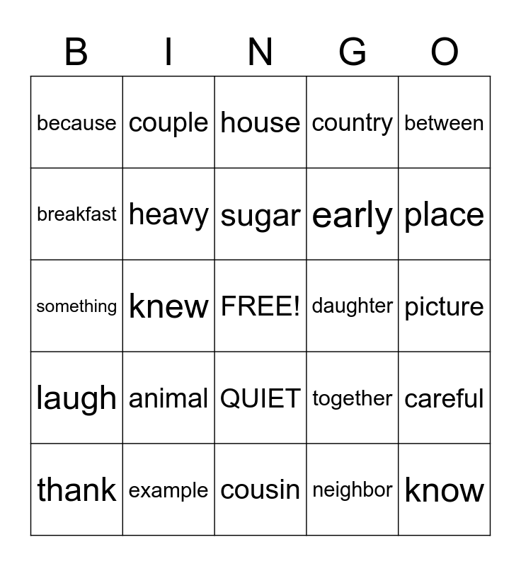 This bingo card has a free space and 24 words: animal, example, sugar, thank, between, because, breakfast, couple, daughter, QUIET, early, something, together, careful, heavy, neighbor, picture, house, place, knew, know, laugh, country and cousin.