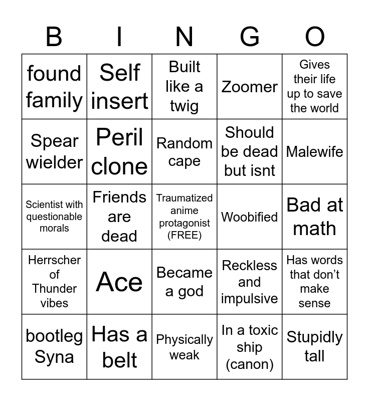 This bingo card has a free space and 84 words: Lightskinned, Long furry ears, Built like a twig, High ponytail, Tall demon horns, Snapdragon clone, Pitch black hybrid feature, Long braid, Pushover/liability, Scuffed honkai impact, Experimented on, Sympathetic villain, Peril clone, Woobified, Herrscher powers, found family, bootleg Syna, Spear wielder, Stupidly short, Works under organization that fights evil, Chinese, Should be dead but isnt, Stupidly tall, Google translated name, Friends are dead, Corruption arc, Straight, LGBTQ coded, Artificial clone, Survivors guilt, Ace, Sexualized, Otto Apocalypse, Scientist with questionable morals, Aetherstar eye syndrome, Really overpowered, Physically weak, 6 pack, Malewife, Herrscher of Thunder vibes, Insane inventor, Against conflict, Fights for peace, Gullible, Flame chaser but not, doomed to die next chapter for angst, Self insert, Canonically attractive, Girl, A hero but not a hero, Saved the world, Reckless and impulsive, Zoomer, Funny but also serious, Boomer, Edgelord, Has a belt, Random cape, Syna styled short sleeves, Bad at math, Bad at socializing, Was revived, Inspired/reference other characters, Chronically memed on, Their whole personality is being sad, Taken away at a young age, Parents are confirmed dead, No biological parents, Gives their life up to save the world, Melee fighter, Has words that don’t make sense, Something about warrior, Canon kill count, Is a god, Became a god, In a toxic ship (canon), Morally questionable depicted as good, Masks their emotions, backboneless, Sunshine protector, Harsh but actually softie, Psychokinetic, Femboy and Milf.