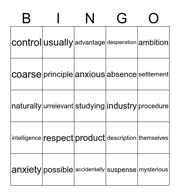 This bingo card has a free space and 24 words: respect, possible, anxious, anxiety, ambition, control, coarse, usually, industry, product, absence, naturally, description, themselves, principle, suspense, procedure, advantage, settlement, urrelevant, mysterious, intelligence, desperation and accidentally.