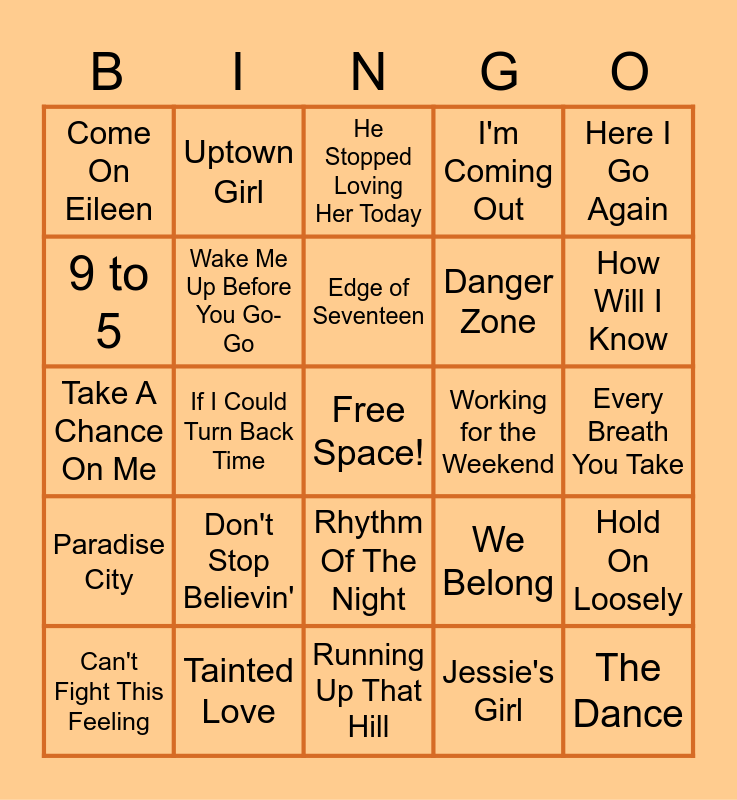 This bingo card has a free space and 98 words: Purple Rain, Beat It, I Wanna Dance with Somebody, Every Breath You Take, Girls Just Want to Have Fun, Karma Chameleon, Sweet Dreams (Are Made of This), Dancing Queen, Celebration, Smooth Criminal, Walking On Sunshine, We Built This City, Jump, Don't Stop Believin', Material Girl, Uptown Girl, Take A Chance On Me, Don't You (Forget About Me), Total Eclipse of the Heart, Hooked On A Feeling, Crocodile Rock, Thriller, Call Me, Holding Out for a Hero, We Didn't Start the Fire, Come On Eileen, Running Up That Hill, Eye of the Tiger, Ghostbusters, Walk Like an Egyptian, Can't Fight This Feeling, 9 to 5, Walk This Way, Living in America, How Will I Know, Pour Some Sugar On Me, I'm Coming Out, Any Way You Want It, If I Could Turn Back Time, Straight Up, The Way You Make Me Feel, Edge of Seventeen, Danger Zone, Physical, I'm Still Standing, Rhythm Of The Night, All My Ex's Live In Texas, Dixieland Delight, On the Road Again, Nothin' But A Good Time, It's Tricky, Nasty, Push It, Super Freak, Rhythm is Gonna Get You, She's A Bad Mama Jama, Paradise City, Another One Bites The Dust, Under Pressure, All Night Long, What's Love Got to Do with It, Hit Me With Your Best Shot, Livin' On A Prayer, Fame, She Works Hard For The Money, Why Not Me, Mountain Music, Killin' Time, Elvira, Smoky Mountain Rain, He Stopped Loving Her Today, Rapper's Delight, Jessie's Girl, Dancing in the Street, Whip It, 867-5309/ Jenny, Let's Dance, Love Is A Battlefield, Never Gonna Give You Up, The Dance, Footloose, Wake Me Up Before You Go-Go, Tainted Love, (I've Had)The Time Of My Life, Dancing With Myself, Ballroom Blitz, My Prerogative, You Shook Me All Night Long, Hold On Loosely, Girls, Girls, Girls, Welcome To The Jungle, We Belong, The Power Of Love, Summer of '69, Working for the Weekend, Need You Tonight, Here I Go Again and Rock You Like A Hurricane.