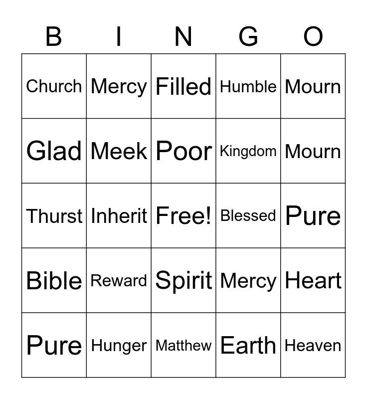 This bingo card has a free space and 24 words: Reward, Hunger, Poor, Pure, Mourn, Church, Glad, Mercy, Blessed, Spirit, Kingdom, Thurst, Mercy, Heart, Meek, Earth, Pure, Filled, Mourn, Inherit, Heaven, Bible, Humble and Matthew.