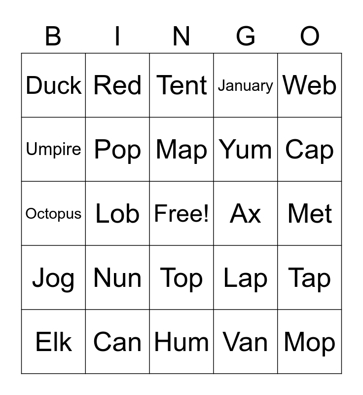This bingo card has a free space and 29 words: Elk, Sun, Lob, Ted, Duck, Tent, Pop, Nun, Ax, Can, Met, Mop, Hum, Van, Cap, Yam, Top, Jog, Web, Octopus, Lap, Wombat, Yum, Umpire, January, Red, Tap, Map and Dog.