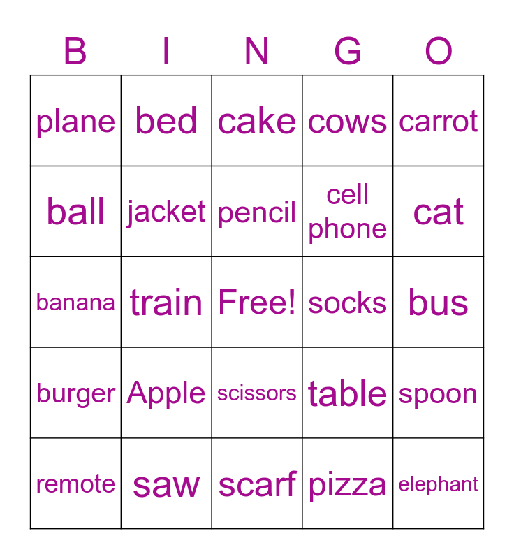 This bingo card has a free space and 24 words: Apple, saw, pencil, remote, carrot, plane, ball, bed, socks, scissors, cell phone, banana, table, spoon, jacket, pizza, bus, cake, cat, train, elephant, burger, cows and scarf.