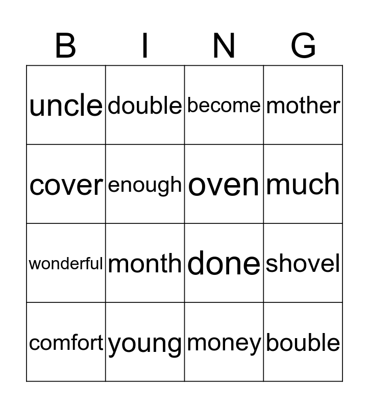 This bingo card has a free space and 15 words: comfort, bouble, become, uncle, much, cover, month, money, enough, wonderful, shovel, mother, oven, double and young.
