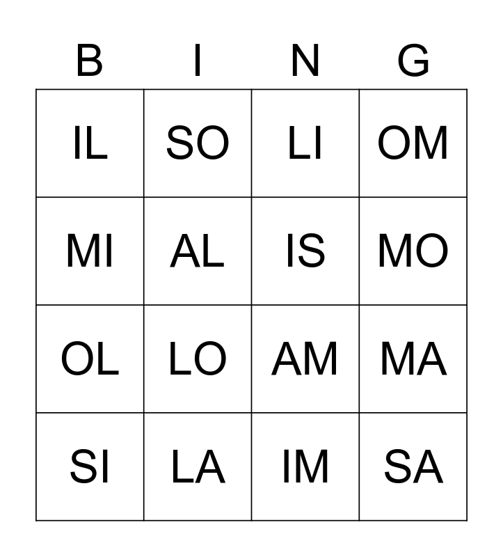 This bingo card has 16 words: LA, MA, LI, IL, OL, SO, AM, IM, MI, AL, SI, OM, LO, MO, IS and SA.