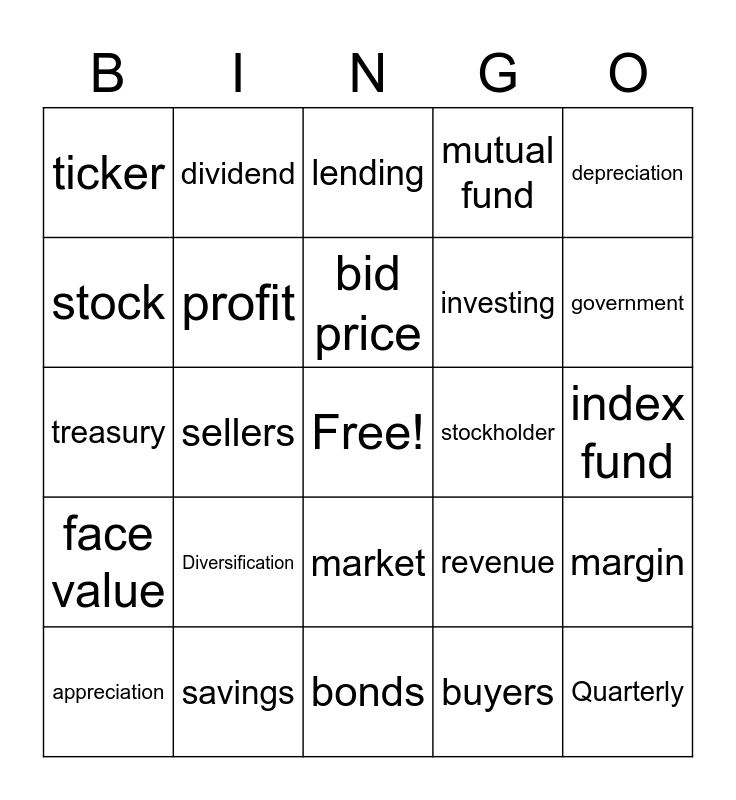 This bingo card has a free space and 25 words: Diversification, bonds, bid price, appreciation, depreciation, ticker, stock, dividend, stockholder, market, investing, treasury, revenue, margin, profit, Dow Jones, index fund, lending, government, sellers, Quarterly, savings, face value, mutual fund and buyers.