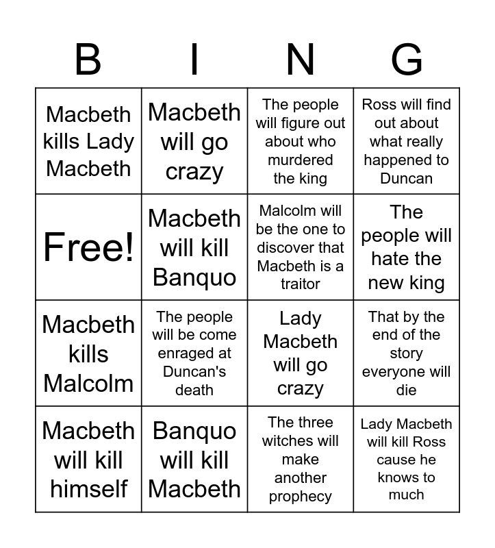 This bingo card has 16 words: Banquo will kill Macbeth, That by the end of the story everyone will die, The people will figure out about who murdered the king, Macbeth kills Lady Macbeth, Macbeth kills Malcolm, Macbeth will go crazy, Lady Macbeth will go crazy, The three witches will make another prophecy, Free!, Macbeth will kill Banquo, Macbeth will kill himself, Ross will find out about what really happened to Duncan, The people will be come enraged at Duncan's death, The people will hate the new king, Malcolm will be the one to discover that Macbeth is a traitor and Lady Macbeth will kill Ross cause he knows to much.