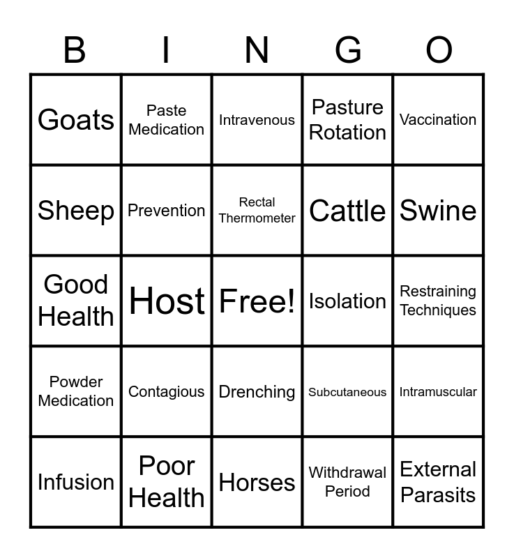 This bingo card has a free space and 32 words: Withdrawal Period, Internal Parasites, Host, Dipping, Powder Medication, Prevention, Vaccination, Intramuscular, Paste Medication, Balling Gun, Rectal Thermometer, Intravenous, External Parasites, Manure, Isolation, Veterinarian Consulting, Infusion, Good Health, Drenching, Contagious, Subcutaneous, Intradermal, Restraining Techniques, Poor Health, External Parasits, Pasture Rotation, Cattle, Sheep, Goats, Horses, Poultry and Swine.