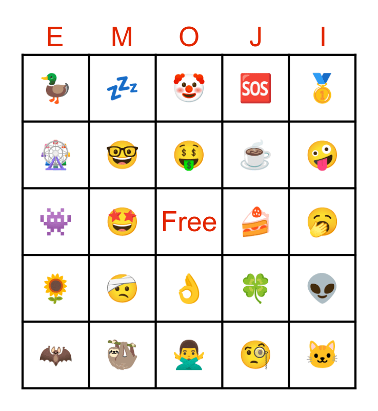 This bingo card has a free space and 54 words: ð, ðŧ, ð, ð, ð, ðĐ, ð, ðŦ, ðĄ, ð, ðĶ, ðķ, ðĶĨ, ðĶ, ðââïļ, ð ââïļ, ðą, â, ð , ðĨą, ð, ðŦ, ð°, ðĨ, ðĪŊ, ðĪ, ðĢ, ðĪ, ðĨš, ð§, ðą, ðĪŽ, ð, âĪïļ, ðĪĄ, ðĪ, ðū, ð―, ðŧ, ðĪ, ð, ðĨģ, ðĪŊ, ðĩâðŦ, ðĪ, ðĪĒ, ðĨķ, ðĪ, ðĪ, ðĪĐ, ðĪŠ, ð, ðĨ° and ðĪĢ.