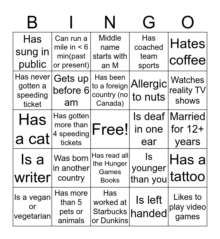 This bingo card has a free space and 24 words: Was born in another country, Has more than 5 pets or animals, Has been to a foreign country (no Canada), Is a vegan or vegetarian, Hates coffee, Has sung in public, Has never gotten a speeding ticket, Can run a mile in < 6 min(past or present), Is deaf in one ear, Has read all the Hunger Games Books, Allergic to nuts, Has a cat, Is younger than you, Has a tattoo, Gets up before 6 am, Is left handed, Married for 12+ years, Middle name starts with an M, Watches reality TV shows, Has gotten more than 4 speeding tickets, Likes to play video games, Is a writer, Has coached team sports and Has worked at Starbucks or Dunkins.