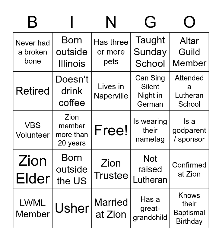 This bingo card has a free space and 31 words: Married at Zion, Zion member less than 5 years, Zion member more than 20 years, Has attended an Easter Vigil, Never had a broken bone, Has three or more pets, Doesn’t drink coffee, Not raised Lutheran, Is wearing their nametag, Has a great-grandchild, Is a godparent / sponsor, Knows their Baptismal Birthday, Knows their Confirmation Verse, Knows all 66 Books of the Bible, Attended a Lutheran School, Baptized at Zion, Confirmed at Zion, Born outside the US, Zion Elder, Zion Trustee, Altar Guild Member, Choir Member, LWML Member, Born outside Illinois, Can Sing Silent Night in German, Retired, Taught Sunday School, VBS Volunteer, Usher, Lives in Naperville and Lives in a Carillon.