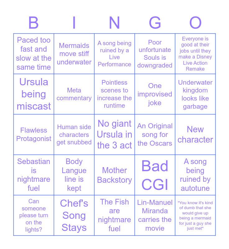 This bingo card has 25 words: Body Langue line is kept, The Fish are nightmare fuel, Pointless scenes to increase the runtime, Can someone please turn on the lights?, Everyone is good at their jobs until they make a Disney Live Action Remake, Paced too fast and slow at the same time, Ursula being miscast, Mermaids move stiff underwater, An Original song for the Oscars, Mother Backstory, One improvised joke, Flawless Protagonist, Bad CGI, A song being ruined by autotune, Meta commentary, "You know it's kind of dumb that she would give up being a mermaid for just a guy she just met", New character, A song being ruined by a Live Performance, Underwater kingdom looks like garbage, Human side characters get snubbed, No giant Ursula in the 3 act, Chef's Song Stays, Sebastian is nightmare fuel, Poor unfortunate Souls is downgraded and Lin-Manuel Miranda carries the movie.