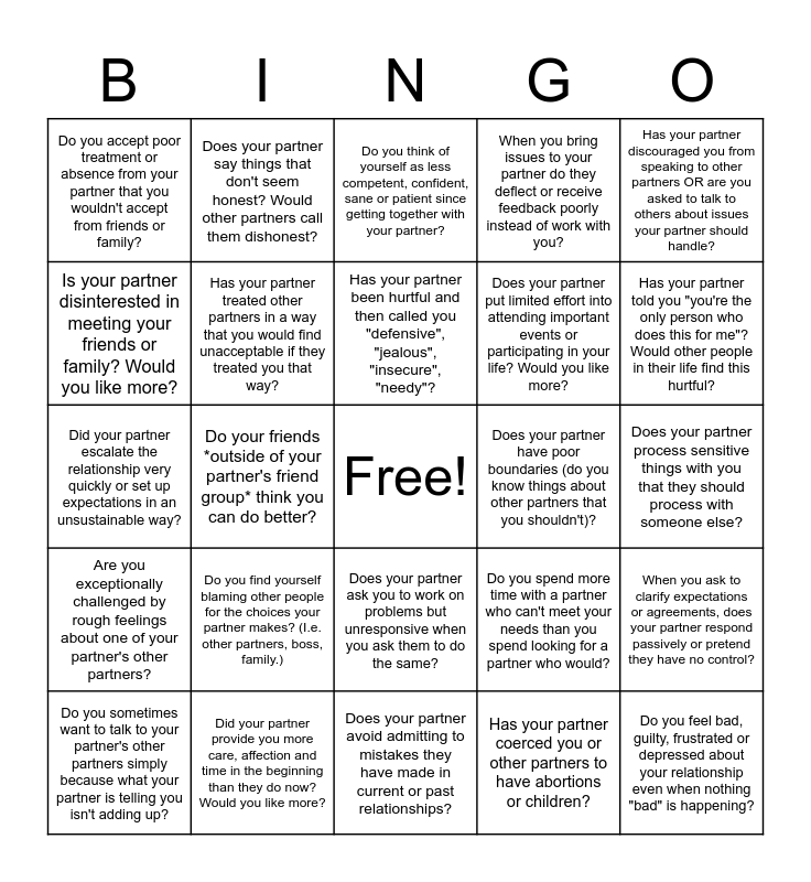 This bingo card has a free space and 34 words: Does your partner expect you to do most of the work around birth control, abortion or STI prevention?, Has your partner coerced you or other partners to have abortions or children?, Has your partner told you that one of their other partners is "controlling", "needy", "jealous", or "threatened"?, Has your partner told you negative things their other partners have said about you?, Are you exceptionally challenged by rough feelings about one of your partner's other partners?, Has your partner treated other partners in a way that you would find unacceptable if they treated you that way?, Has your partner discouraged you from speaking to other partners OR are you asked to talk to others about issues your partner should handle?, Do you sometimes want to talk to your partner's other partners simply because what your partner is telling you isn't adding up?, Does your partner say things that don't seem honest? Would other partners call them dishonest?, Do you feel that you are in an environment of scarcity or competition? Are you told you're asking for too much?, Has your partner been hurtful and then called you "defensive", "jealous", "insecure", "needy"?, Do you think of yourself as less competent, confident, sane or patient since getting together with your partner?, Do you feel like you're on a roller coaster with highs very high and lows very low?, Is something is getting in the way of you getting physical needs met (food, meds, sleep)?, Does your partner have poor boundaries (do you know things about other partners that you shouldn't)?, Has your partner told you "you're the only person who does this for me"? Would other people in their life find this hurtful?, Did your partner provide you more care, affection and time in the beginning than they do now? Would you like more?, Did your partner escalate the relationship very quickly or set up expectations in an unsustainable way?, Do you find yourself blaming other people for the choices your partner makes? (I.e. other partners, boss, family.), Do you spend more time with a partner who can't meet your needs than you spend looking for a partner who would?, Does your partner ask you to work on problems but unresponsive when you ask them to do the same?, Do you feel like you have to apologize all the time?, Do you accept poor treatment or absence from your partner that you wouldn't accept from friends or family?, Does your partner process sensitive things with you that they should process with someone else?, Does your partner avoid admitting to mistakes they have made in current or past relationships?, Do you feel bad, guilty, frustrated or depressed about your relationship even when nothing "bad" is happening?, When you bring issues to your partner do they deflect or receive feedback poorly instead of work with you?, Do you do disproportionate work to make the relationship function? Does it mostly rely on your effort?, Does your partner put limited effort into attending important events or participating in your life? Would you like more?, Is your partner disinterested in meeting your friends or family? Would you like more?, Does your partner ask to use your phone, email address or bank information for their own purposes?, Do your friends *outside of your partner's friend group* think you can do better?, When you ask to clarify expectations or agreements, does your partner respond passively or pretend they have no control? and Has your partner ever said something like "you know what you signed up for" when you bring up your needs?.