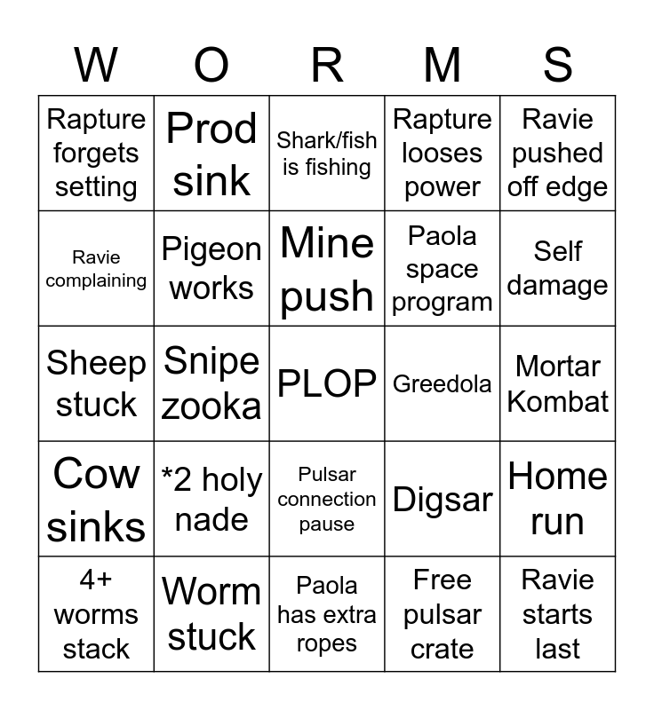 This bingo card has a free space and 29 words: 4+ worms stack, Jola move, Snipe zooka, Failed rope knocking, Rapture forgets setting, Shark/fish is fishing, Pigeon works, *2 holy nade, Greedola, Worm stuck, Mortar Kombat, Ravie starts last, Paola has extra ropes, Free pulsar crate, Self damage, Rapture falls down, Pulsar connection pause, Cow sinks, Ravie pushed off edge, Sheep stuck, Digsar, Rapture double sg, Paola space program, Ravie complaining, Rapture looses power, Prod sink, Home run, Mine push and Fry kill.
