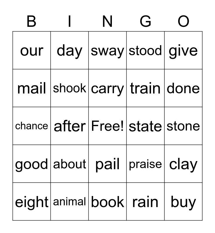This bingo card has a free space and 24 words: about, animal, carry, eight, give, our, mail, day, state, pail, train, chance, praise, clay, shook, rain, stone, sway, done, after, buy, good, stood and book.