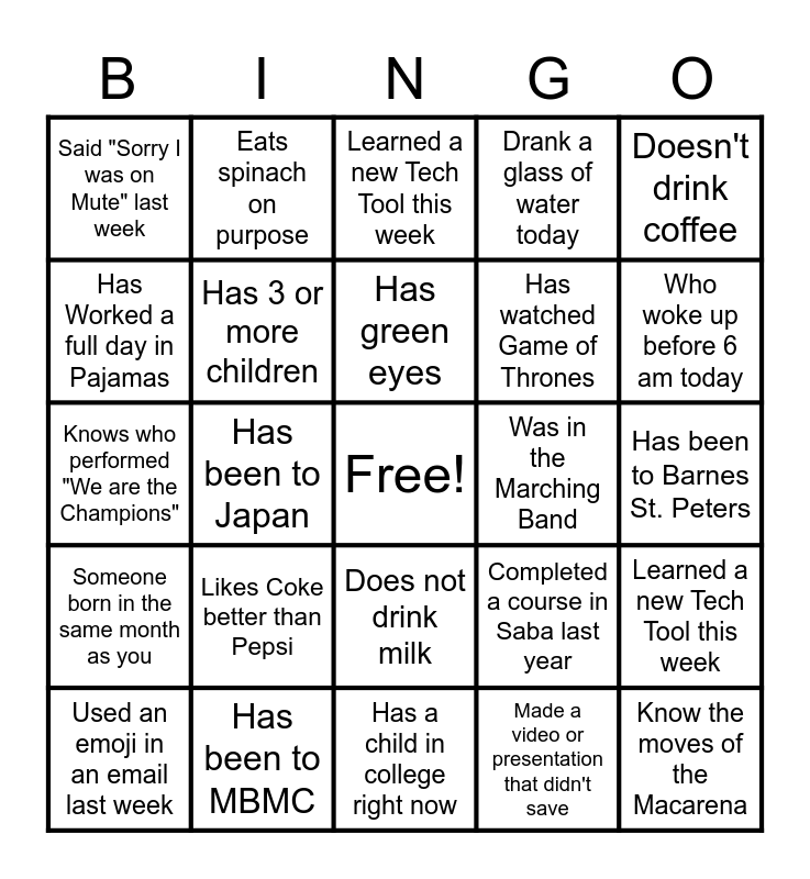 This bingo card has a free space and 29 words: Used an emoji in an email last week, Heard "Can you hear me" on a call last week, Has been to Japan, Someone who has made a Tic Tok video, Said "Sorry I was on Mute" last week, Learned a new Tech Tool this week, Has 3 or more children, Likes Coke better than Pepsi, Was in the Marching Band, Has been to MBMC, Has been to Barnes St. Peters, Know the moves of the Macarena, Has a child in college right now, Made a video or presentation that didn't save, Who woke up before 6 am today, Has 2 or more siblings, Does not drink milk, Someone born in the same month as you, Doesn't drink coffee, Knows who performed "We are the Champions", Completed a course in Saba last year, Ran a Marathon, Has watched Game of Thrones, Has Worked a full day in Pajamas, Drank a glass of water today, Eats spinach on purpose, Learned a new Tech Tool this week, Has green eyes and Has not been to the West Coast.