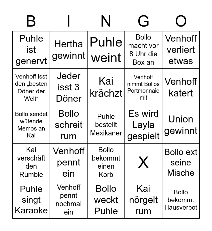 This bingo card has 25 words: Venhoff pennt ein, Bollo weckt Puhle, Kai krächzt, Puhle singt Karaoke, Venhoff verliert etwas, Puhle ist genervt, Venhoff isst den „besten Döner der Welt“, Hertha gewinnt, Es wird Layla gespielt, Bollo bekommt einen Korb, Venhoff nimmt Bollos Portmonnaie mit, Bollo sendet wütende Memos an Kai, X, Bollo ext seine Mische, Jeder isst 3 Döner, Bollo bekommt Hausverbot, Union gewinnt, Puhle weint, Venhoff katert, Bollo schreit rum, Puhle bestellt Mexikaner, Venhoff pennt nochmal ein, Kai verschäft den Rumble, Bollo macht vor 8 Uhr die Box an and Kai nörgelt rum.
