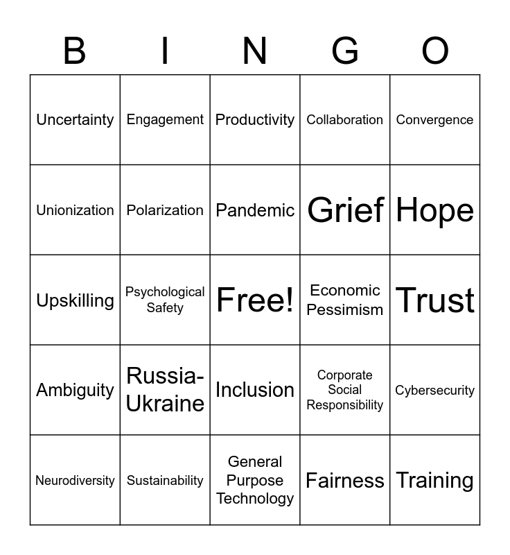 This bingo card has a free space and 24 words: Russia-Ukraine, Sustainability, Pandemic, Neurodiversity, Convergence, Uncertainty, Unionization, Engagement, Economic Pessimism, Inclusion, Grief, Upskilling, Corporate Social Responsibility, Cybersecurity, Polarization, Fairness, Trust, Productivity, Hope, Psychological Safety, Training, Ambiguity, Collaboration and General Purpose Technology.
