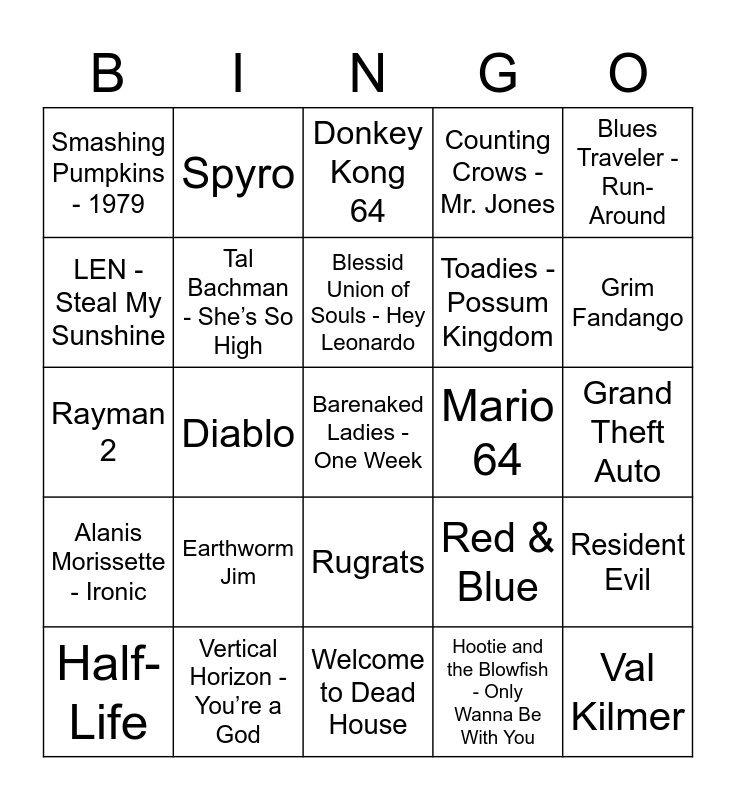 This bingo card has 60 words: Goo Goo Dolls - Slide, Vertical Horizon - You’re a God, Weezer - My Name is Jonas, Alanis Morissette - Ironic, Hootie and the Blowfish - Only Wanna Be With You, Sugar Ray - Every Morning, Tal Bachman - She’s So High, Everclear - Wonderful, Toadies - Possum Kingdom, Dave Matthews Band - Crash, Counting Crows - Mr. Jones, 311 - Amber, LEN - Steal My Sunshine, New Radicals - You Get What You Give, Korn - Freak on a Leash, Smashing Pumpkins - 1979, Barenaked Ladies - One Week, Blues Traveler - Run-Around, Train - Drops of Jupiter, Blessid Union of Souls - Hey Leonardo, Mario 64, Donkey Kong 64, Half-Life, Resident Evil, GoldenEye 007, The Legend of Zelda: Ocarina of Time, Sonic the Hedgehog, Crash Bandicoot, Grim Fandango, Tony Hawk’s Pro Skater, Doom, Banjo-Kazooie, The Secret of Monkey Island, Tomb Raider, Spyro, Earthbound, Myst, Diablo, Silent Hill, Rayman 2, Clock Tower, Earthworm Jim, Grand Theft Auto, Nintendo 64, Red & Blue, Tamagotchi, Lara Croft, JNCO, Beanie Babies, Rugrats, Welcome to Dead House, Geoffrey, Barcelona, Titanic, Jonathan Taylor Thomas, The Taming of the Shrew, FernGully: The Last Rainforest, Michael Crichton, Val Kilmer and Alicia Silverstone.